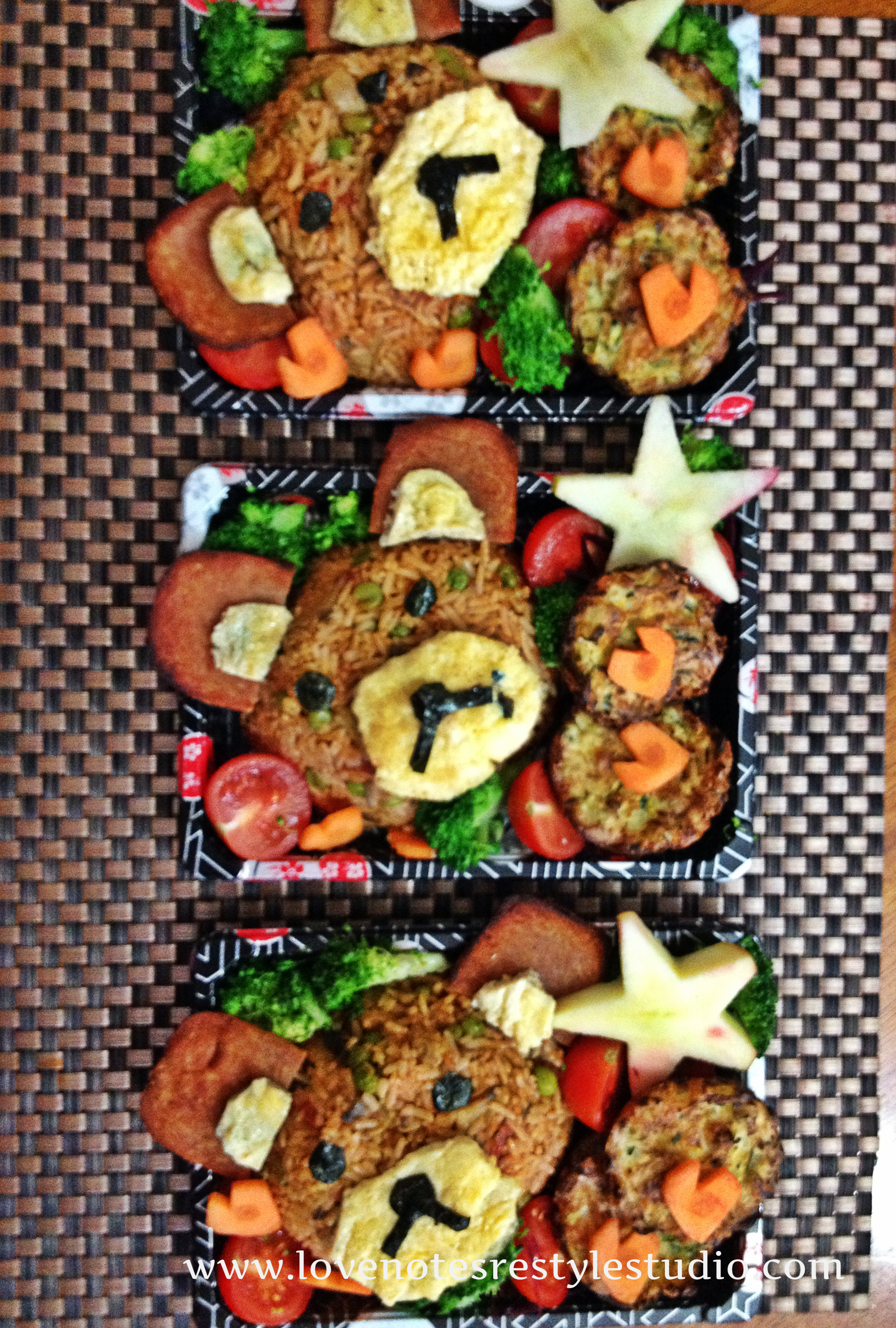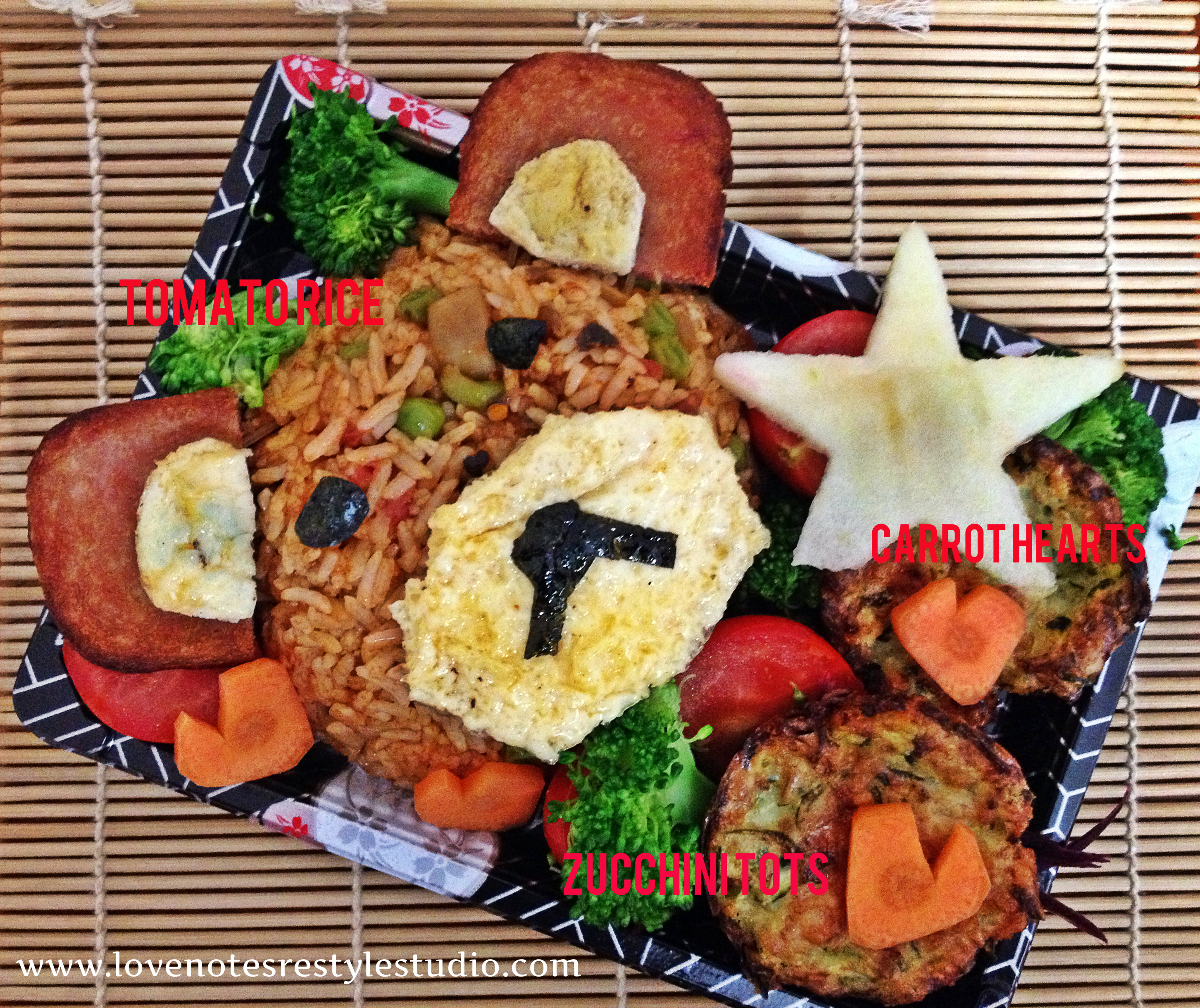 Tomorrow we’ll give you the recipes for the Zucchini Tots and the Tomato Rice (Omurice). It took about 1.5 hours all together to get it all together and was so much fun to create.