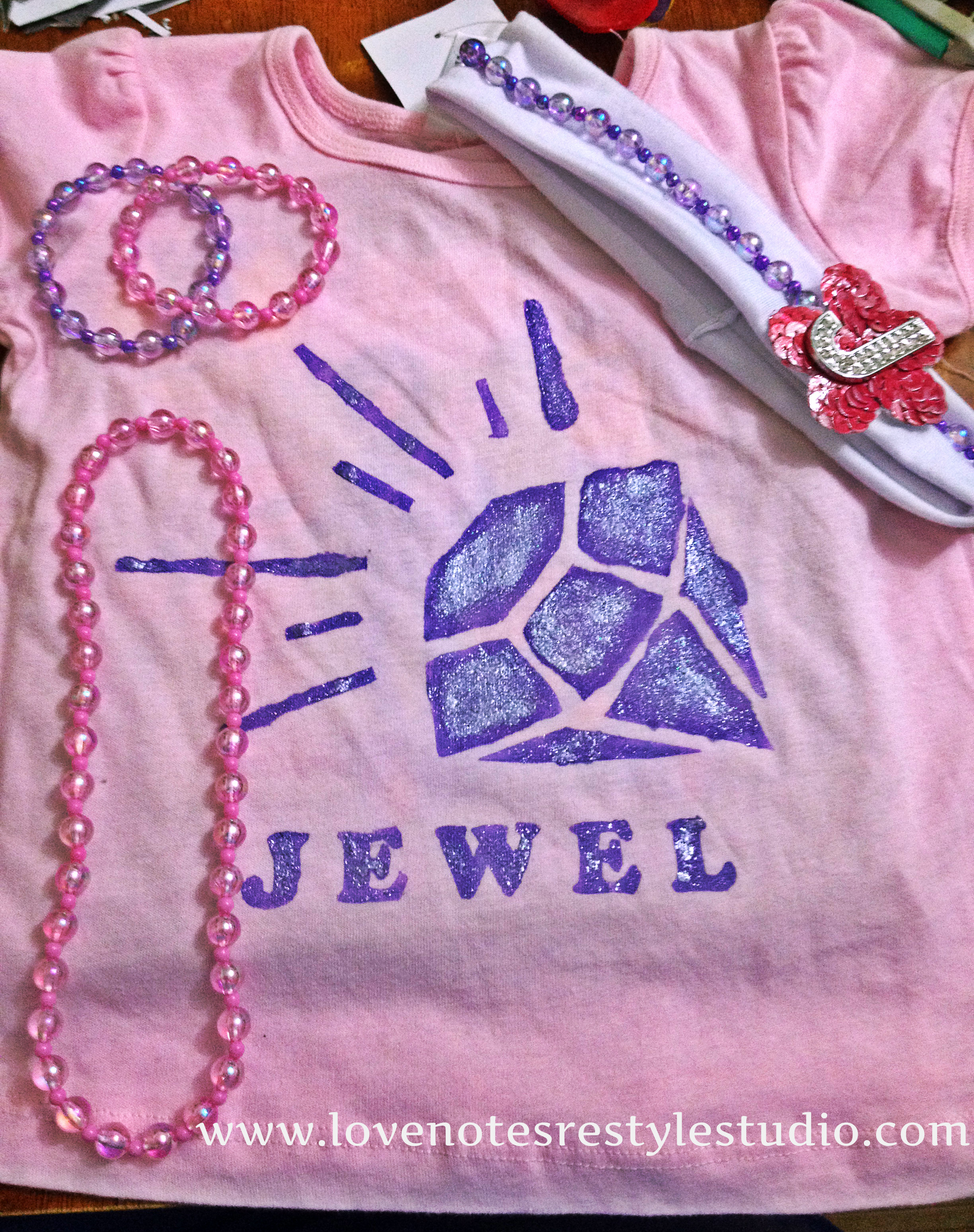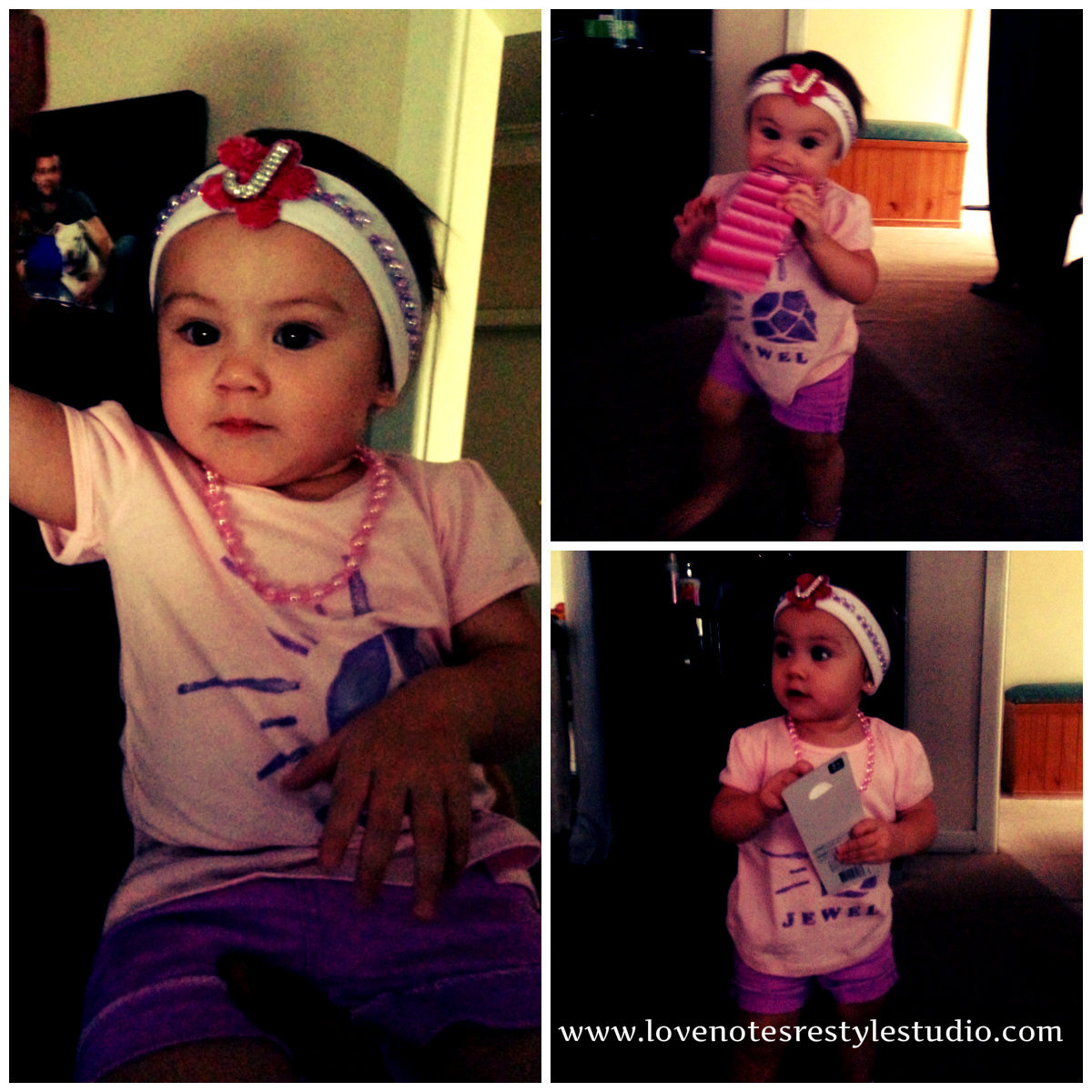 I created a costume for Jasmine so that she could be a Jewel for the night. I found some bits and bobs to be her bling and made her a t shirt and a headband.