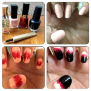 The three colours used were light peach, red and black. We love the design and it is relatively easy to do as you don’t really need a steady hand – the messier the better. To do the lines we used an old applicator from a liquid eye liner.